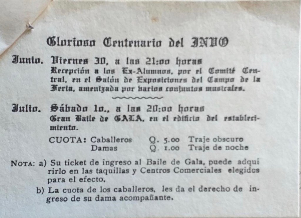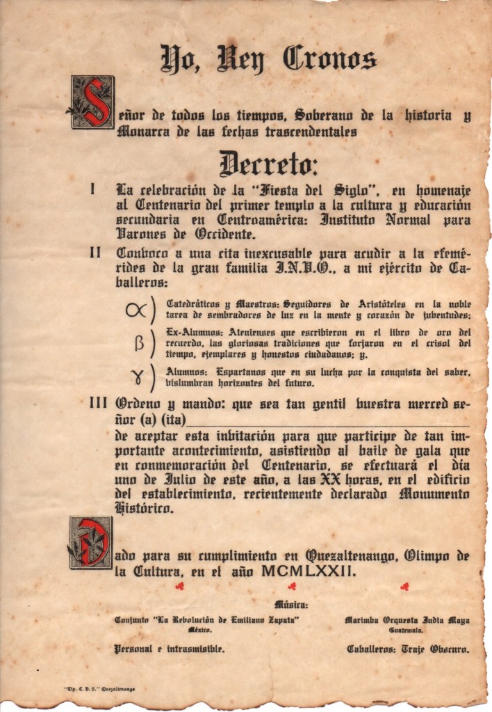 Así se nombró al baile de gala programado para celebrar el centenario del Instituto Normal para Varones de Occidente, Quetzaltenango Guatemala. Con motivo de esta fiesta, se enviaron unas originales y muy elegantes invitaciones, impresas en papel pergamino con las orillas quemadas, escritas con letra gótica. Se enviaron enrolladas y lacradas con color vino tinto; amarradas con una cinta azul y blanca; el sello de estampado contenía el escudo del Instituto. Las invitaciones se enviaron durante el mes de junio de 1972.