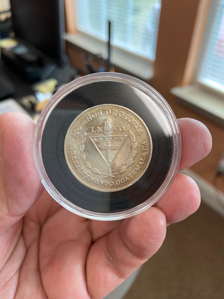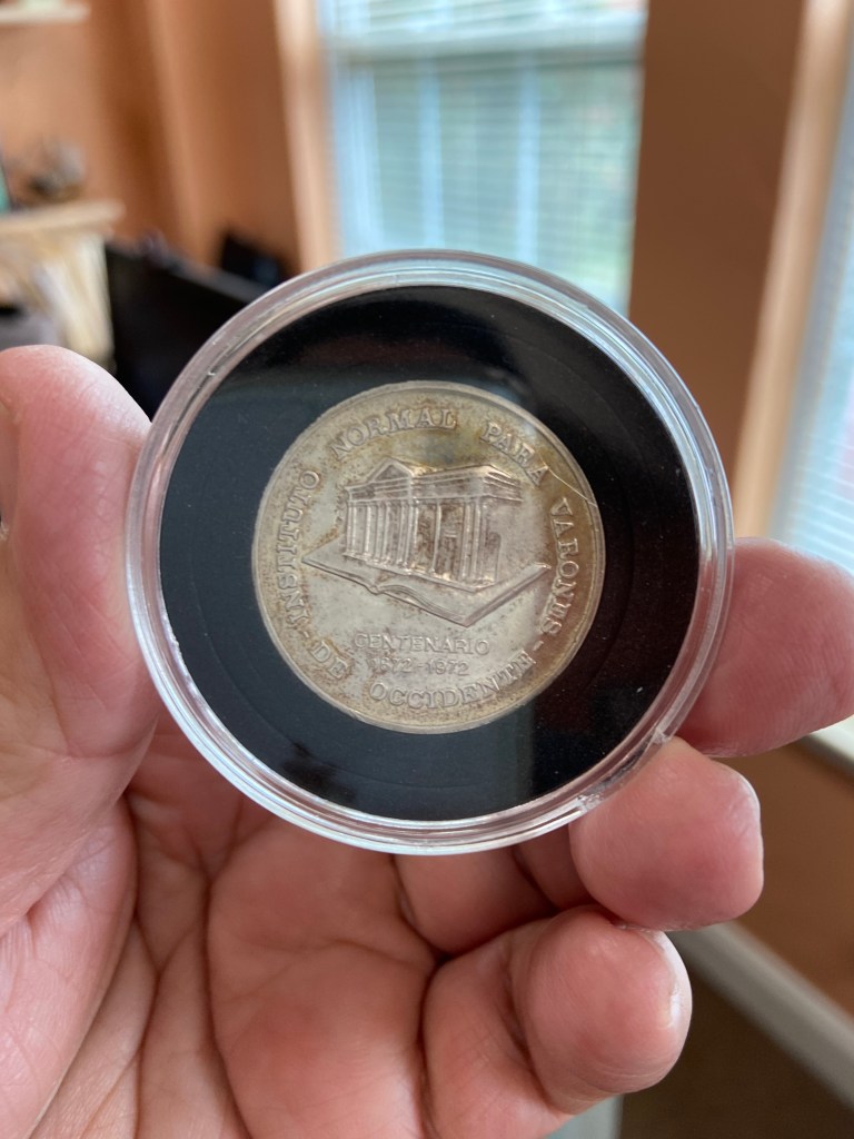 Mi moneda conmemorativa del Centenario del INVO (1872 – 1972); sólo necesita una limpiada para quitarle un poco de pátina. En ese entonces cursaba el cuarto grado de magisterio. Muchas lunas han pasado.